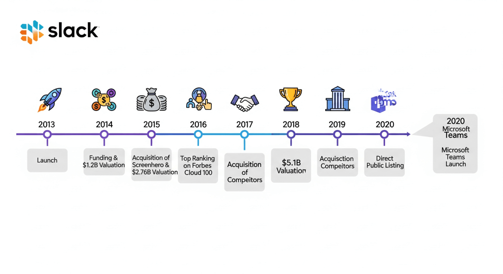 - 2020: Microsoft launches Teams, its direct competitor, as a bundled service with its Office suite. This marked the end of Slack’s unchecked market dominance and began a new era of intense competition.