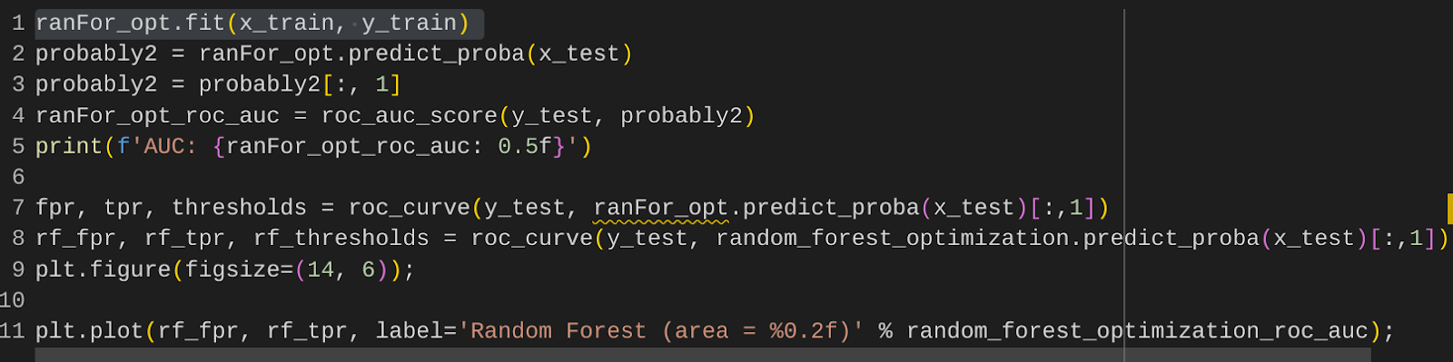 To measure the performance of each of these models, to make the best selection going forward, the metrics of the area under the curve (AUC) receiver operating characteristic (ROC), as well as the accuracy of each model. Briefly, the ROC-AUC describes the ability of the model to differentiate between classes; the higher the AUC, the better the model is at this distinction. Therefore, using Python and sklearn, Figure 2 displays an example of model performance code for the random forest.
